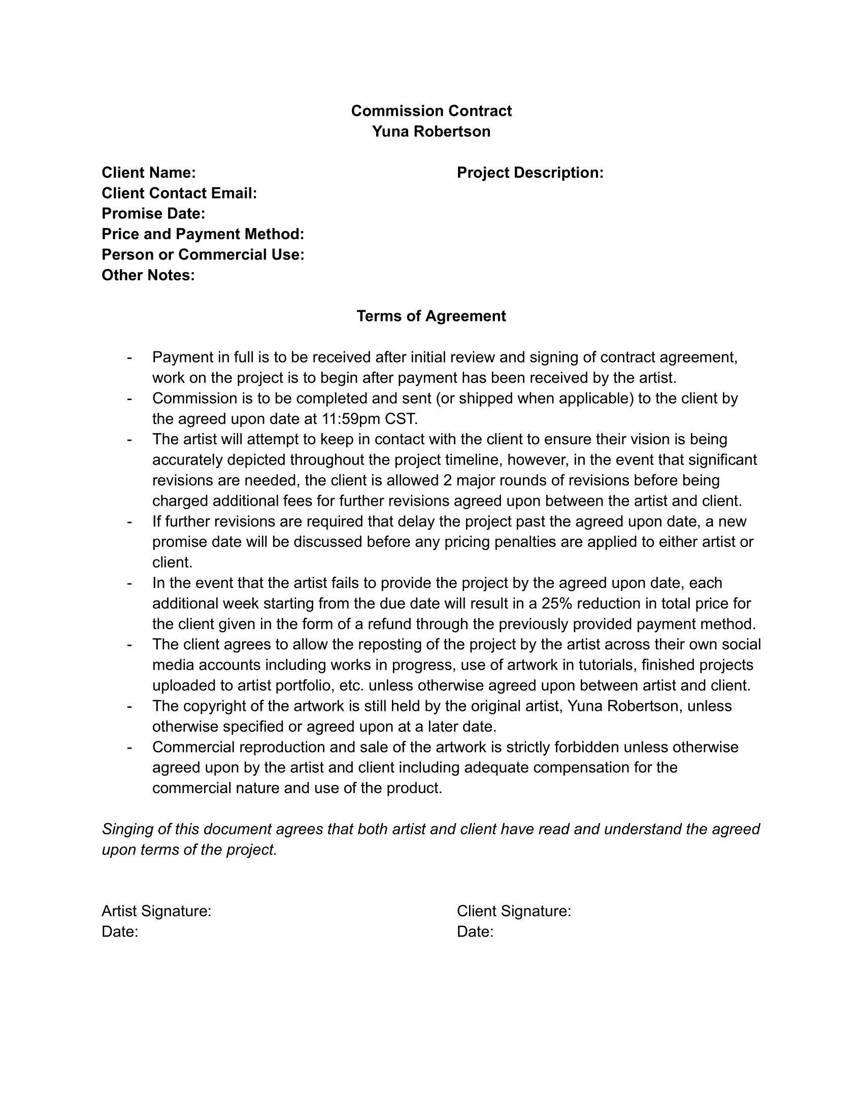 Below is a sample contract clients are sent after initial discussion of their desired project.