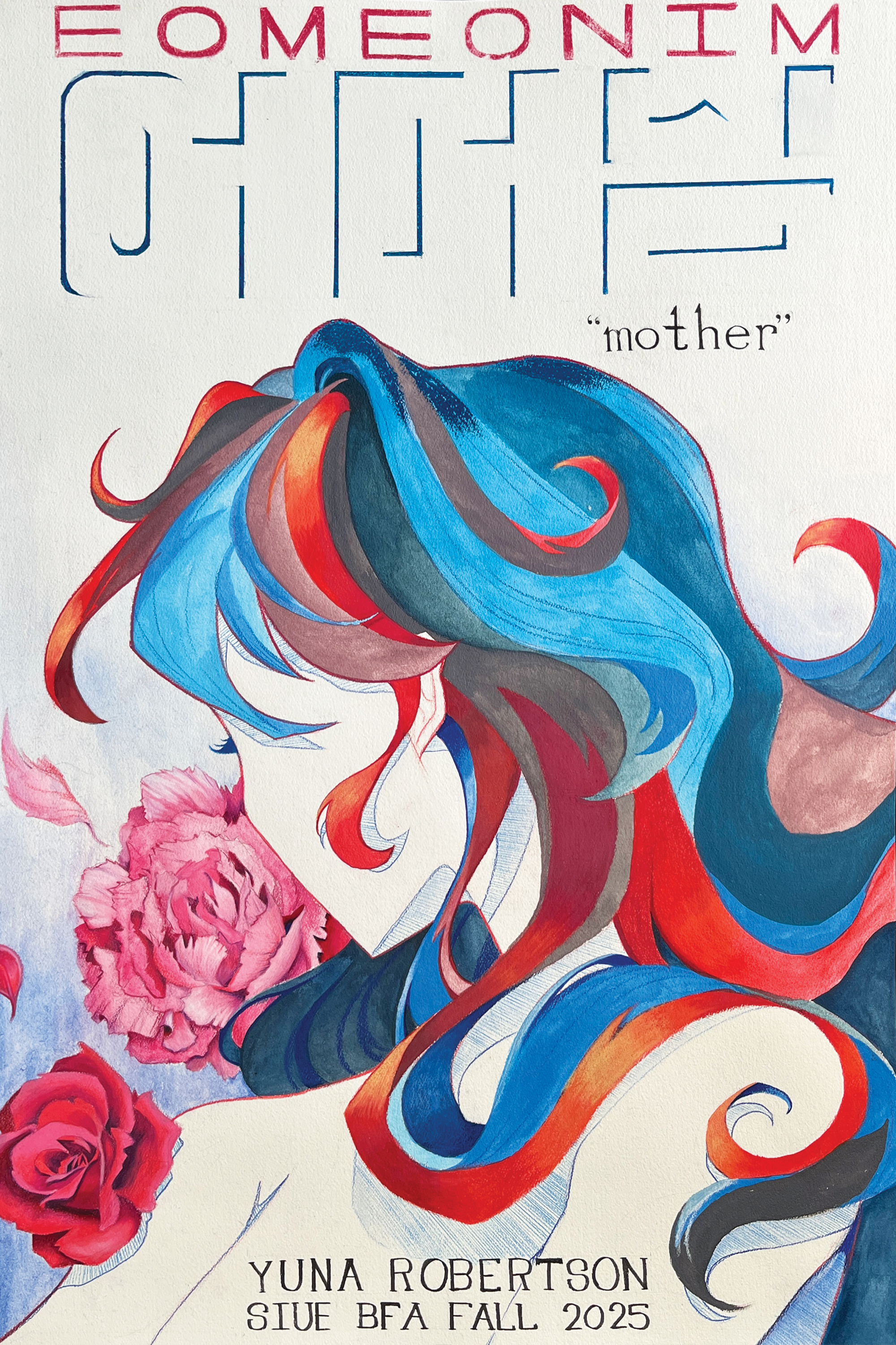 “EOMEONIM” is a short, speculative fiction manga using excerpts from my own adoption papers to build a visual story of my birth parents. Each panel varies in its mediums from traditional black and white inking, hand-carved woodblock prints, wood engraving, watercolor, and more.